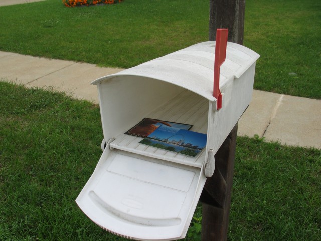 Briefe und Postkarten bringt man in den USA nicht zur Post, sondern man packt sie in den eigenen Briefkasten und macht das kleine Fähnchen nach oben. Der Briefträger, der hier mit dem Auto kommt, nimmt sie dann mit. |
