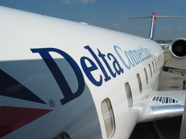 Unser Flugzeug, wieder eine Canadair CRJ-200. Es steht zwar DeltaConnection drauf, aber eigentlich fliegen wir mit einer Fluggesellschaft namens Comair. |
