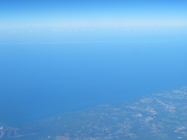 Okay, es sieht alles ziemlich blau aus. Das ganz blaue ist aber der Eriesee, wenn ihr genau hinschaut, könnt ihr eine lange Landzunge sehen, das ist Long Point in Kanada, wo ich im Februar mit Sebastian war. Unten am Ufer kann man die andere Seite des Sees nicht sehen. |