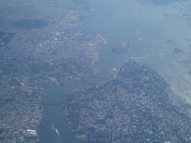 Hier der dazugehörige Blick aus dem Fenster. Wenn ihr von den Hochhäusern schräg nach rechts oben geht, seht ihr zwei kleine Inseln. Mit Hilfe einer Lupe, könnt ihr auf der kleineren, weiter oben gelegenen, die Freiheitsstatue erkennen. |