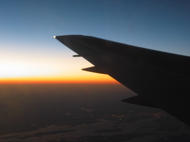 Irgendwie müssen wir etwas deutsches an uns haben, ich vermute mal, das kommt von meinem Vater, jedenfalls fragt uns die Flugbegleiterin, ob wir nach Berlin fliegen. Ich sage ja und da meint sie, daß sie aus Stettin kommt. Wenn man sich mitten in den USA trifft, dann ist das schon ziemlich dicht beieinander. Das Flugzeug ist nicht ausgebucht und so haben wir eine 2+2-Sitzreihe für uns alleine. Meine Mutter nutzt das ganz schön aus und springt dauernd hin und her. Ich hingegen klebe mein GPS-Gerät ans Fenster und schau mir an, wo wir so langfliegen. Die Strecke entspricht ziemlich genau derjenigen, die ich im Februar mit dem Auto gefahren bin: Es geht über Indianapolis, Cleveland, am Eriesee entlang und dann in Richtung New York City.