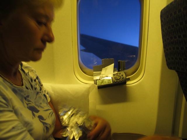Irgendein Mensch in einer Reihe vor uns hat es richtig gut. Der kann nämlich schlafen und schnarcht richtig dabei. Aber er hat auch nicht direkt über sich einen Fernseher hängen, dessen Hell- und Dunkelflackerei einen wegen des schummrigen Lichts in der Kabine verrückt macht. Da hilft nur Decke über den Kopf ziehen, so sehe ich zwar ziemlich dämlich aus, aber man erträgt es einigermaßen. Notiz für die nächste Reise: Nackenrolle und Schlafmaske mitnehmen.